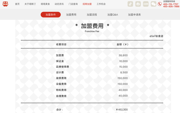 塔斯汀采用加盟模式扩张。官网信息显示,一家65平米的店面,加盟费超45万,加上门店的转让费、房租、水电、人力等,启动资金预计要60万起步。据其招商人员,门店员工建议7-8人,由加盟商自主招聘,在开店前员工有为期1-2个月的培训。