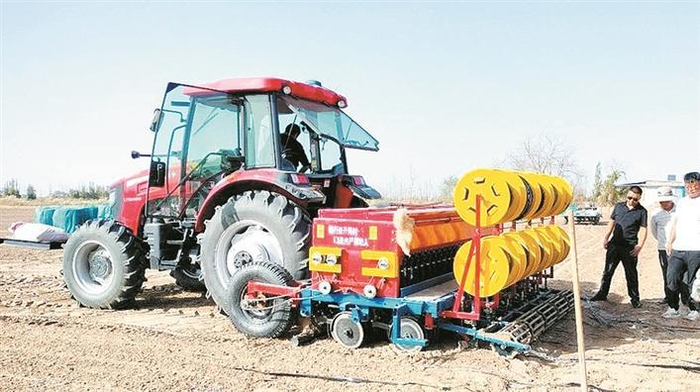 在一师十团条田里,一台机车进行冬小麦播种作业(资料图片)。今年以来,十团扛牢保障粮食安全政治责任,持续深化农业供给侧结构性改革,推动粮食生产提质增效。 黄蓓 摄