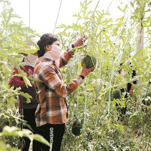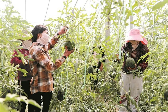 在一师十团十九连的阿拉尔市郭牌农业科技有限公司万亩西瓜温室大棚种植基地,工人们忙着采收成熟的西瓜(资料图片)。十团充分发挥地缘优势,大力发展设施农业,推动农业绿色转型。黄蓓 摄