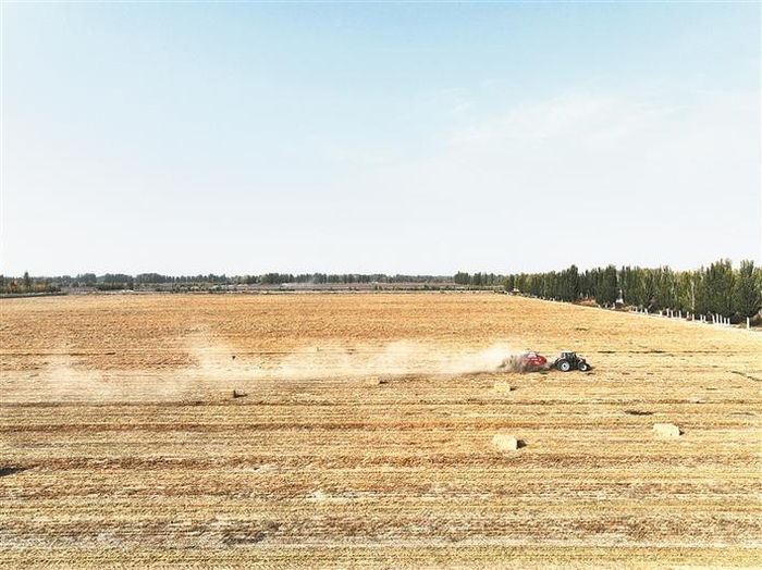 在一师十团五连“茴香+小米”特色农产品生产基地,一台秸秆回收打捆机正在大田里作业(资料图片 )。围绕农业转型升级,十团集成推广农业绿色技术,推动创建国家农业绿色发展先行区。黄蓓 摄
