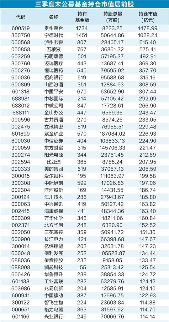 从持仓市值来看,公募基金三季度重仓股中,贵州茅台、宁德时代、泸州老窖、五粮液、药明康德、迈瑞医疗、恒瑞医药、招商银行、山西汾酒、中国平安位列前十大重仓股。