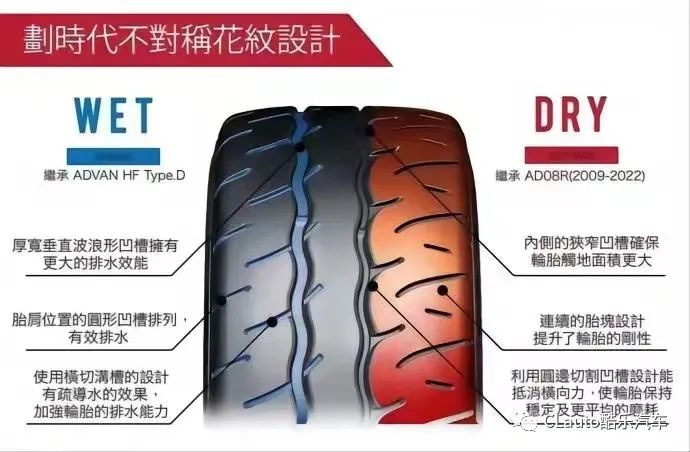 AD09采用了非对称的设计,外侧依然和AD08类似,有着很强的干地抓地性能;但是在内侧,设置了粗壮的排水竖槽。