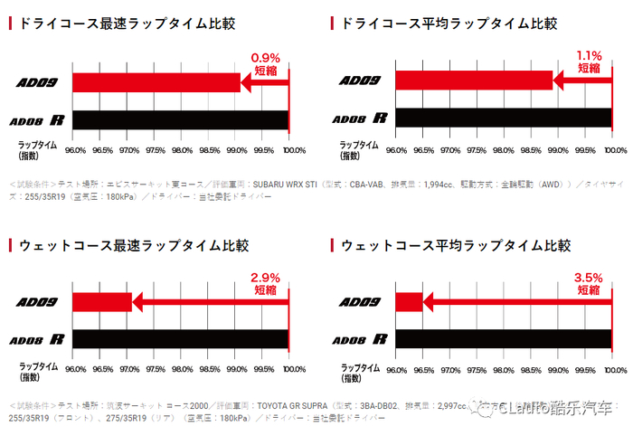 干地单圈最快速度,AD09相比AD08R缩短了0.9%,平均圈速缩短了1.1%。(测试地点,惠比寿赛道东赛道;车辆为Subaru Wrx STi型号:CBA-VAB,排量:1994cc,全轮驱动AWD;轮胎尺寸,255/35R19,胎压1.8bar)。