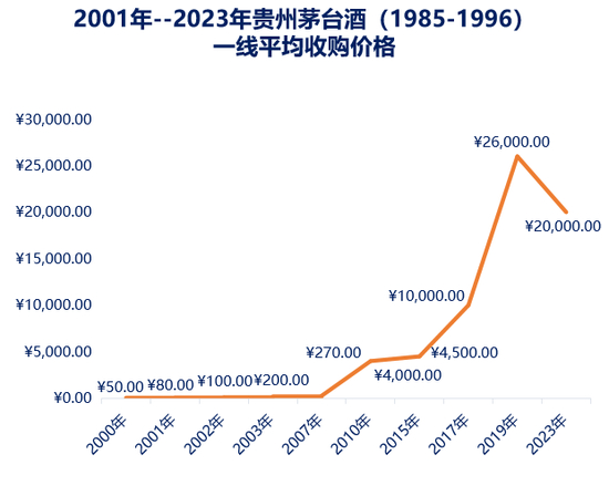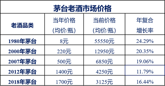 贵州茅台酒(1985-1996)出厂以来至今,各年份产品的价格均实现了数百倍的增长。其中,1987年份的茅台酒当前市场价格较出厂时零售价增长了30935元,翻了477倍。