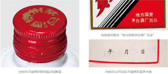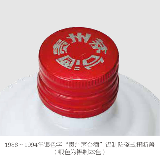 1986年至1987年2月年生产的扭断式防盗金属铝盖茅台酒彩盒上印有“地方国营茅台酒厂出品”字样,1986~1989年五星标识扭断式防盗金属铝盖茅台盖顶的“贵州茅台酒”有金色和银色两种,金色是一层防锈漆,银色是铝的本色;1986~1990年的度数和容量标注在包装盒上;1986~1988年内销的五星标识茅台酒精度数为54%vol。