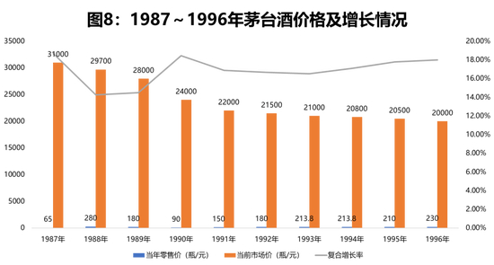 同时,分别测算这一时期早年份1987年和晚年份1996年两个年份茅台酒近10年来的价格增速,分别为82.6%和254%。按此逻辑推算,贵州茅台酒(1985-1996)未来10年的价格极有可能在现有基础上翻番。