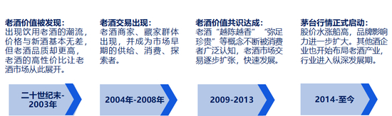 第四个阶段是2014年至今,老酒行情正式启动,线上线下交易模式出现多元化,各酒企开始重视并积极布局老酒业务。