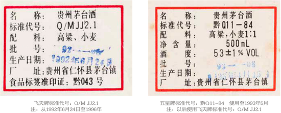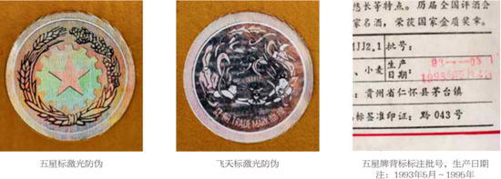 1995年五星标识茅台酒有两种背标:一种背标与1993~1994年格式相同,并标注红色生产日期,同时包装盒上食品标签也标注生产日期;另一种背标印有“生产日期及批号见瓶口”。