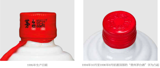 特征:1994年12月份以后的茅台酒瓶盖顶部的“贵州茅台酒”由原来的平面更改为凸起,瓶盖与原来的红色相比略浅。