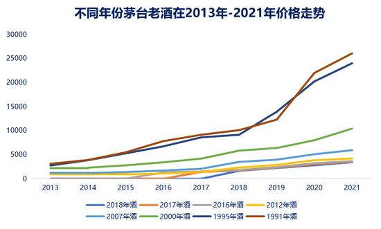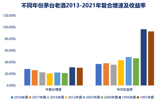 从近10年交易数据看,茅台老酒的投资收益率高于茅台新酒,即老酒比新酒品牌溢价更高。1995年出厂的茅台酒在2013年-2021年的年复合增幅为31.11%,2018年出厂的飞天茅台酒在2018年-2021年的年复合增幅为28.14%,相较于年份越早的茅台酒,增速较低。另外,老酒的年均收益率远高于新酒或次新酒,如上数据显示,1995年出厂的茅台酒在2013年-2021年的年均收益率达到96.67%,而2018年出厂的飞天茅台酒在2018年-2021年的年均收益率为36.79%。