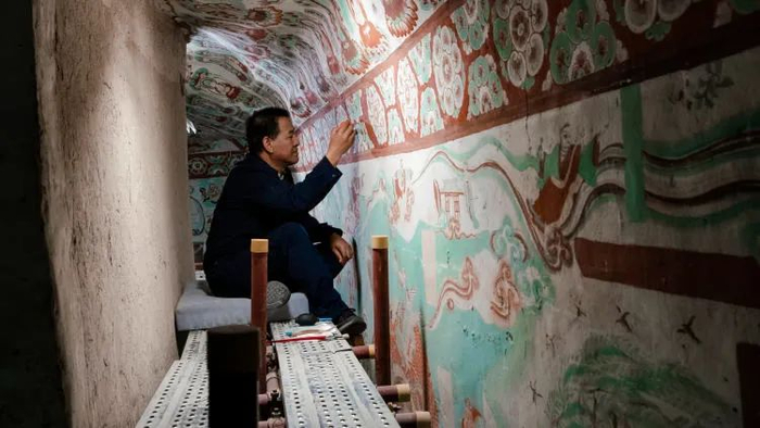 杨韬将自己形容为靠手艺吃饭的“手艺人”,看着日新月异的新科技,他偶尔感到疑惑,却始终秉持开放拥抱的态度,每当科研人员进洞窟检测,他都会叫上徒弟们前来观摩,他告诉他们:“你们要多交流,你们更年轻,以后还有更多的机会与科技打交道。”他还会嘱咐徒弟们:“如今科技水平上来了,咱们做修复的,千万不能在最后上手环节上掉链子。”