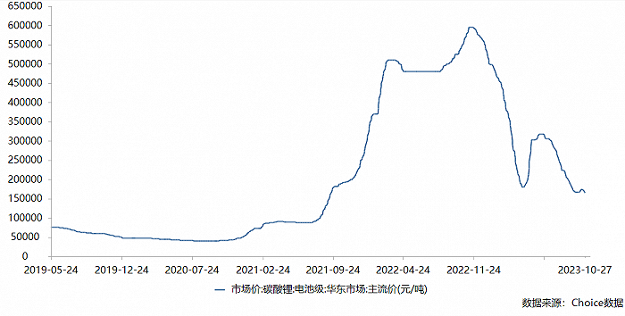 不过,这一情况在今年逆转。Choice数据显示,2022年11月,电池级碳酸锂价格最高接近60万元/吨,2023年以来进入下行阶段,一季度最低跌破20万元/吨,4月-5月曾快速上涨至30万元/吨以上,但随后价格震荡下行,截至10月27日,电池级碳酸锂价格仅为16.60万元/吨。