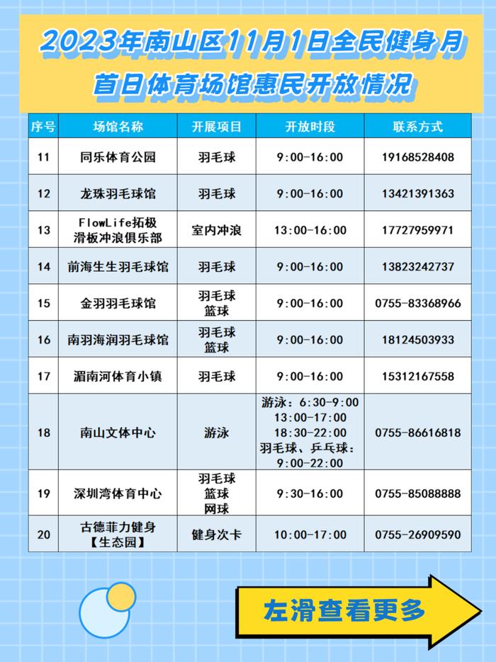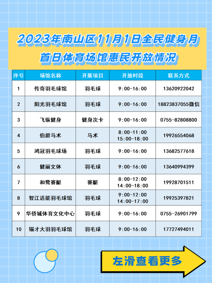● 南山:为迎接11月全民健身月的到来,在11月1日当天南山区共有31家体育场馆免费对公众开放。