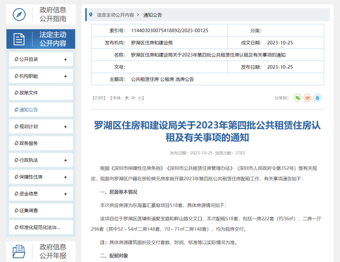 ● 罗湖:罗湖区2023年第四批公租房正在认租!本次供应房源为东海富汇豪庭项目518套,面向罗湖区户籍在册轮候无房家庭。