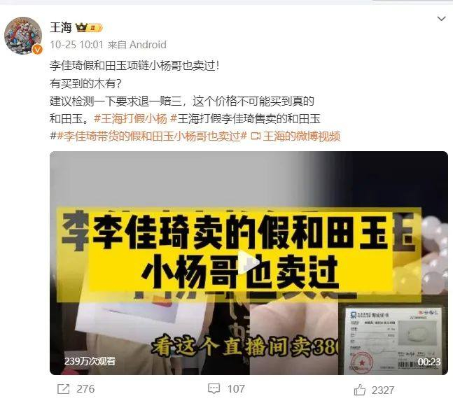 王海还在微博中称,该和田玉项链小杨哥也卖过。