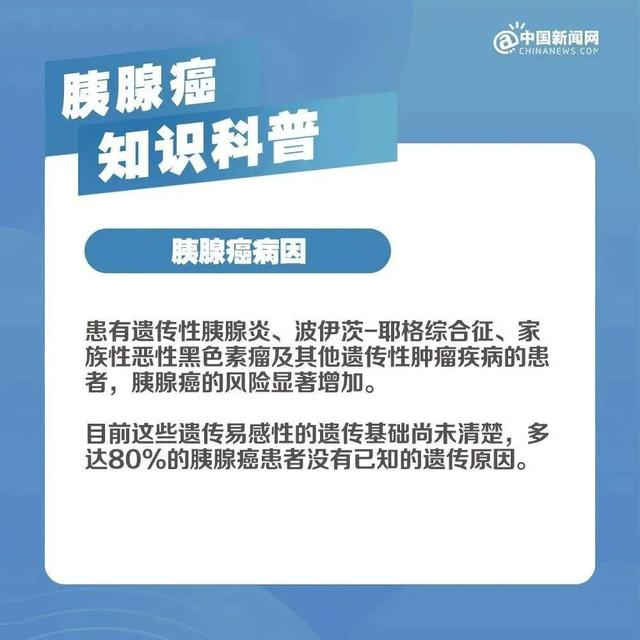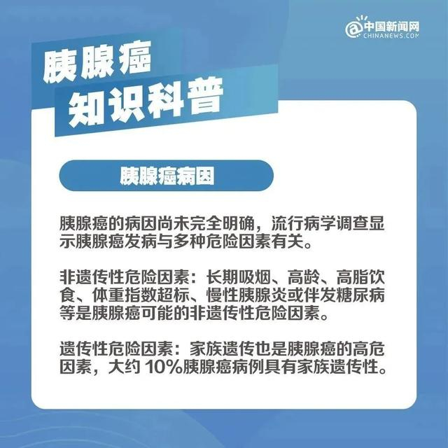 根据国家卫健委发布的《胰腺癌诊疗指南(2022年版)》,目前胰腺癌的病因尚未完全明确,流行病学调查显示胰腺癌发病与多种危险因素有关。长期吸烟,高龄,高脂饮食,体质量指数超标、慢性胰腺炎或伴发糖尿病等是胰腺癌可能的非遗传性危险因素。家族遗传是胰腺癌的高危因素,大约10%胰腺癌患者具有家族遗传性。