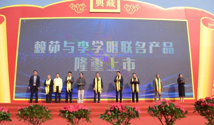 山东省纪委派驻省委宣传部原纪检组长、一级巡视员关华,中国美术家协会会员、山东省美术家协会顾问、国家一级美术师、山东工艺美术学院教授李学明等领导共同启动景阳冈赖茆与李学明先生联名产品上市仪式。