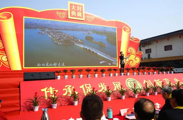 封藏大典在歌伴舞《一壶老酒》中拉开帷幕,领导、专家、大师共同上台品尝景阳冈美酒,为美酒封坛储藏。