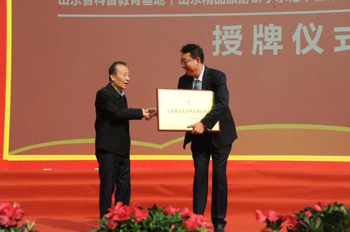 山东省委原副秘书长、山东省精品旅游促进会会长杜文彬为企业颁授“山东精品旅游研学示范单位”奖牌。