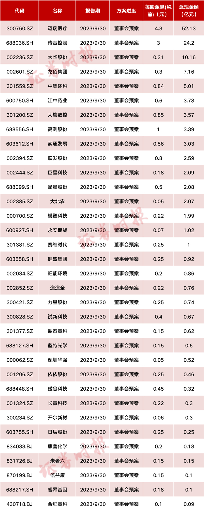 数据显示,截至目前,迈瑞医疗、传音控股、大华股份等三季报拟派现金额居前,分别为52.13亿元、24.20亿元、10.16亿元。