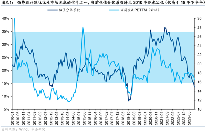 “A股估值分化系数降至2010年以来次低。”华泰证券研究团队王以指出,“热门对比冷门资产的估值溢价进一步收敛,历史上全A的收益率(TTM)底部通常伴随着估值弥合,强势股补跌往往是市场见底的信号之一。”