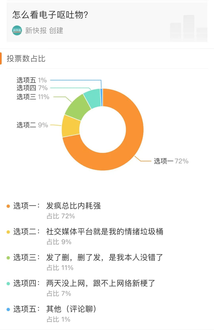 调查显示,在参加投票的1070名网友中,72%的网友表示“发疯总比内耗强”,也有11%的网友经常“发了删,删了发”。