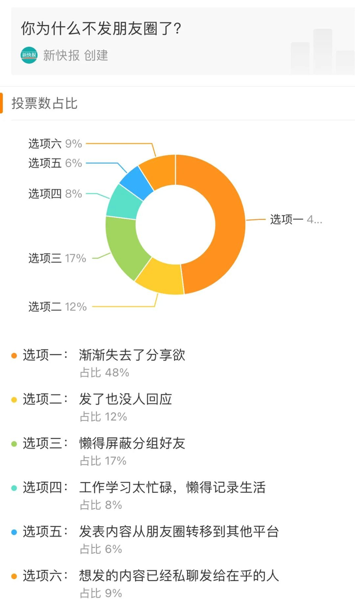 近日,@新快报 在微博中投票调查显示,网友不发朋友圈的最大原因是“渐渐失去了分享欲”,占比48%;懒得屏蔽分组好友,所以不发朋友圈的人占了17%;同时,12%的网友认为“发了没人回应”使他们渐渐丧失了发朋友圈的欲望。