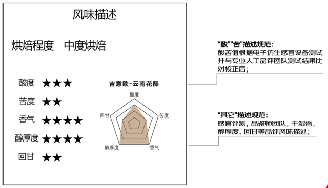 本“标准”中,“酸度和苦度”两项指标,一改过去难以用语言描述或衡量的问题,而是综合专业的电子仿生感官设备测试和专业人工品评团队测试校正后得出结果,更直观更精准。