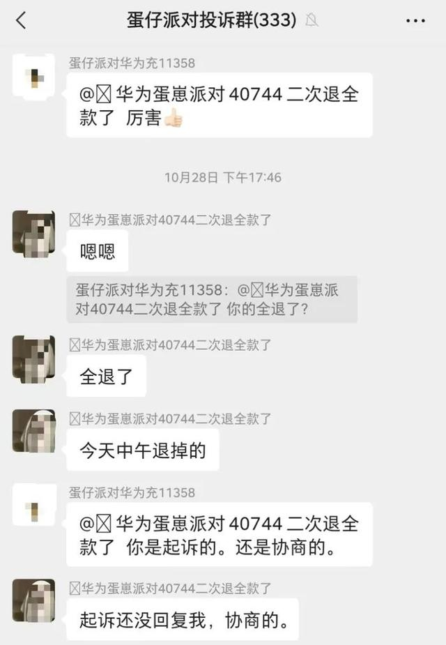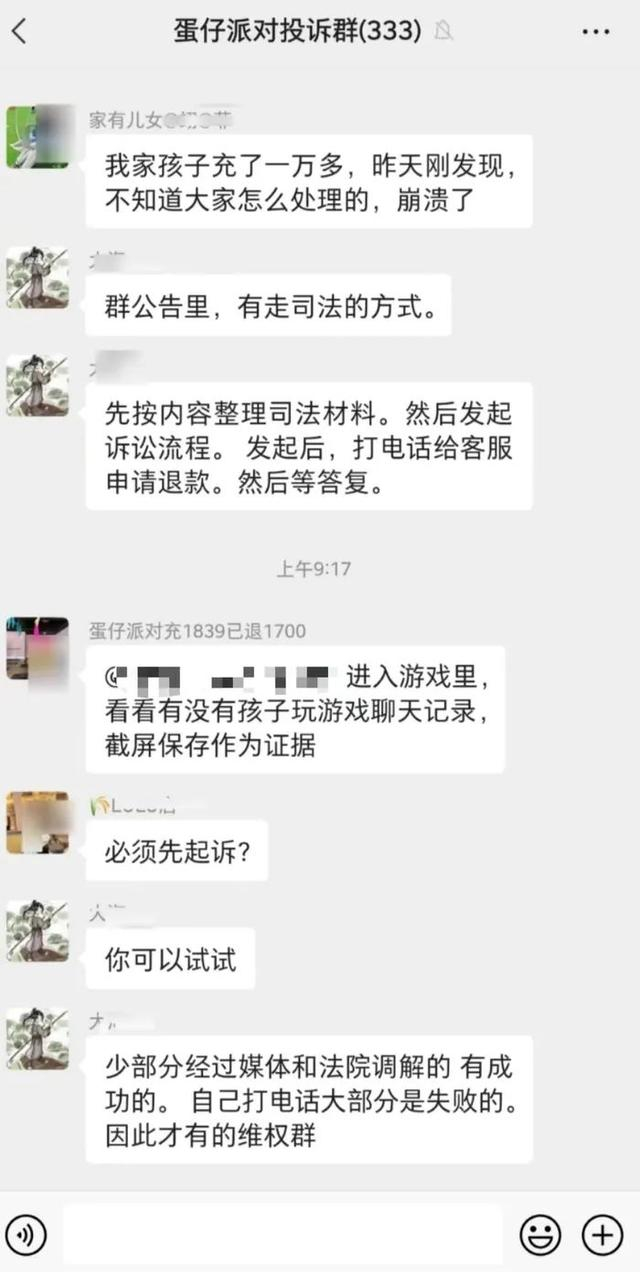 叶先生把全额退款的消息发到聊天群后,群友们瞬间不“淡定”了。“你是怎么做到的?”“真幸运,太不容易了”“这么多钱都全退了,看来我们维权也有希望了”……叶先生所在的“蛋仔派对投诉群”中,聚集了300多位孩子家长,他们跟叶先生遭遇大致相同,都是未成年人玩《蛋仔派对》进行多笔充值后,在退款时遭遇各种阻碍。