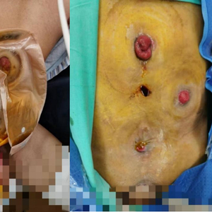 董先生平素体面而自信,患病后腹部疼痛和瘙痒、长期易发烧、进食困难等问题影响着生活,更让他痛苦的是,他的体表同时有4个出口持续性排出消化液和粪渣,护理非常困难。巨大的身心负担也导致他近乎抑郁,畏惧进食,出现重度营养不良,生活暗淡无光。但他仍然积极、坚强面对问题,继续辗转于国内多家医院诊治。