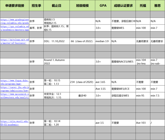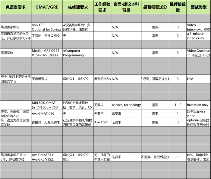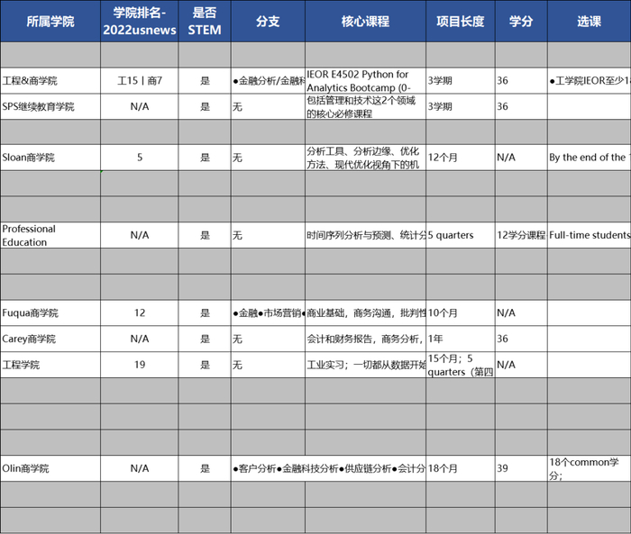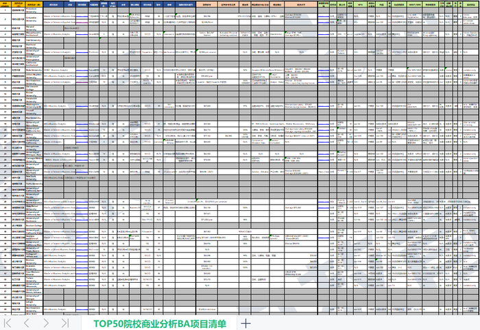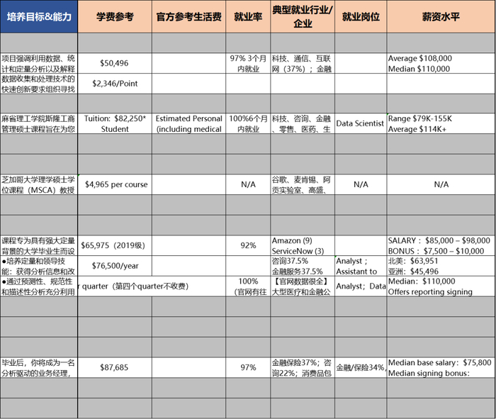 不同BA硕士基础信息(学费、时长、核心课程等等)、项目就业情况(就业率,毕业生平均起薪,典型就业行业&岗位&公司),项目招生需求(先修课、GPA、托福、GRE/GMAT、工作经验、面试情况、推荐信等)……