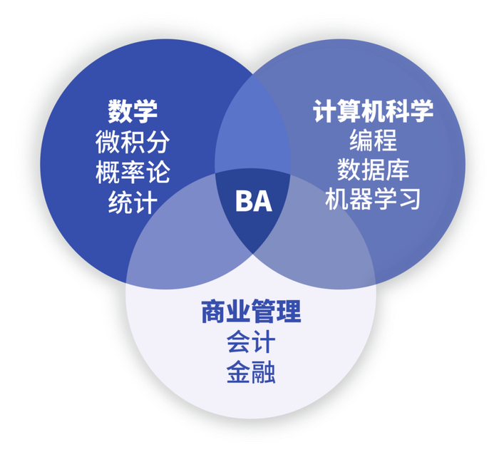 BA是一门交叉性和综合性都很强的学科,学生需要在数学、计算机和商业三个方面都掌握一些知识和技能。