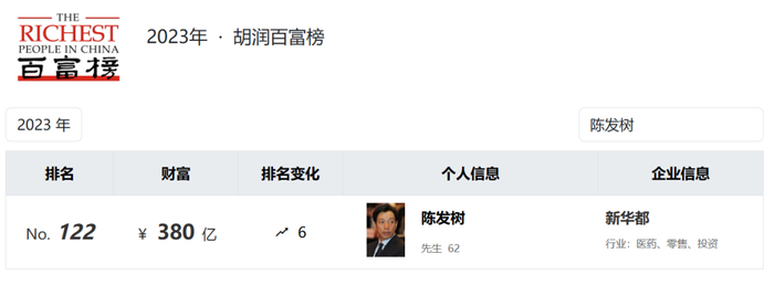 陈发树乃A股市场的“超级牛散”,曾经因成功投资紫金矿业,从中暴赚数百倍而一举成名。随后他又投资青岛啤酒、云南白药、隆基绿能、中国中免等多家知名企业,均获利颇丰。在2023年的胡润百富榜上,陈发树以380亿元的财富排名第122位。