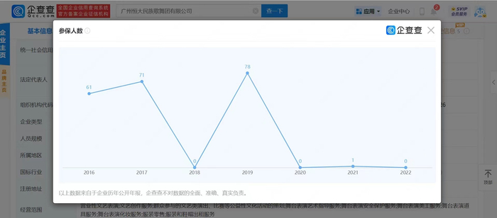 值得关注的是,年报信息显示,该歌舞团2022年参保人数已降为0人,而2019年最高参保人数为78人。