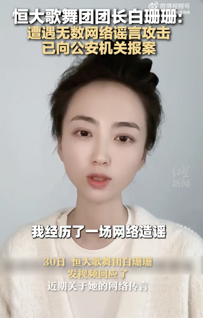 据红星视频10月30日消息,恒大歌舞团团长白珊珊今日发布视频表示:遭遇无数网络谣言攻击,已向公安机关报案。