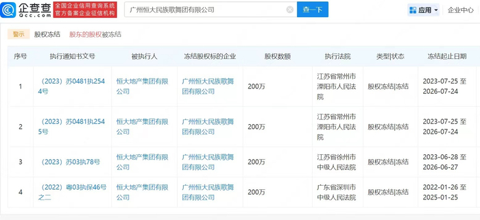 企查查风险信息显示,该公司存在多条股权冻结信息,被执行人均为恒大地产集团有限公司,冻结股权数额200万。