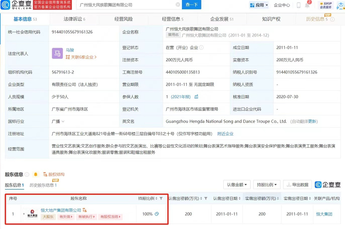 另外,据企查查APP搜素“恒大歌舞团”显示为广州恒大民族歌舞团有限公司,成立于2011年,注册资本200万元,由恒大地产集团有限公司全资持股。经营范围包含营业性文艺表演、文艺创作服务、群众参与的文艺类演出、比赛等公益性文化活动的策划等。