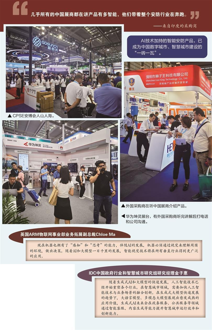 记者还注意到,在本届CPSE安博会中出现了很多外国面孔,中国智能安防产品出海正跑出“加速度”。有参展商向记者表示其刚从拉美回国,也有来自印度的采购商向记者感叹:“几乎所有的中国展商都在讲产品有多智能,他们带着整个行业在奔跑。”
