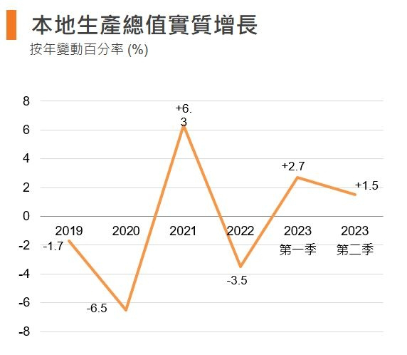 第一季度,香港GDP增速2.9%,但第二季度增速只有1.5%。甚至,经过季节性调整之后,第二季度增速变为 -1.3%。