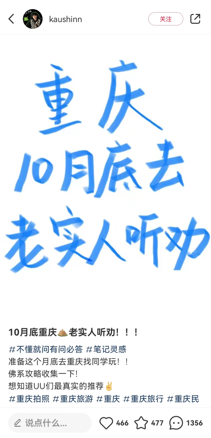 网友“kaushinn”10月11日发布了一条笔记:10月底去重庆,老实人听劝!帖子发出后,“kaushinn”收到了一千余条网友的回复,其中有几位正在重庆旅游的网友发出善意提醒:重庆最近天凉了,记得穿外套。也有不少重庆本地人极力推荐自己认为不错的住宿地点以及老火锅店铺。另外,还有一位曾来重庆旅游过的网友分享了一份自己总结的旅游攻略,详细推荐了必去的景点、必看的演出以及好吃的火锅店。“kaushinn”觉得这份建议非常实用。