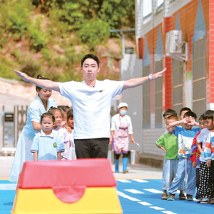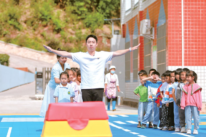 前奥运体操冠军邹凯教泸州市古蔺县白泥镇中心幼儿园的小朋友们练体操 摄/唐浩