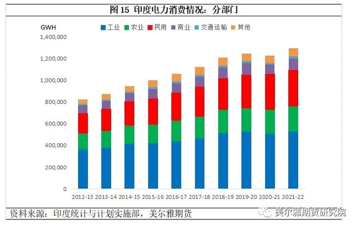 分部门来看,印度电力消费中,工业与居民部门占比居前。2021-22财年,印度总用电量1,296,300 GWH,其中,工业部门用电量533,500 GWH,占总用电量的比重为41%;居民部门用电量334,000 GWH, 占总用电量的比重为26%;两大部门合计用电量占印度总用电量的比重接近70%。值得留意的是,印度居民部门的用电量在过去十年间持续提升,即便在疫情影响严重的2020-21财年,印度居民部门用电量也实现了正增速,环比增长速度高达7.15%,而同期的工业、商业、交通运输等部门用电量均为负增长,这是因为居民生活用电本身具有偏刚性的特点。长期来看,印度城乡电气化水平的提升与工业生产能力的增长是工业与居民部门用电增长的核心动力。
