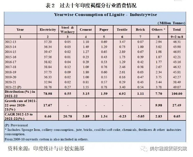 电力是印度煤炭最大的下游消费行业。根据印度统计与计划实施部数据,2021-22财年印度煤消费量10.28亿吨(不含褐煤),其中用于电力的煤消费量为7.0986亿吨,占其煤消费总量的比重高达69%;其次是钢铁-炼焦行业,2021-22财年该行业煤消费量为6538万吨,占印度煤消费总量的比重为6%。此外,印度煤炭还广泛应用于水泥、造纸、纺织、海绵铁、化工、建材等行业。印度煤及褐煤的分行业消费情况具体如表1、表2所示。近十年间,印度煤用于水泥、造纸、纺织、海绵铁、化工、建材等行业的量有明显的下降趋势,煤更加集中地被用于电力和钢铁行业。2021-22财年,印度褐煤消费量4907万吨,其中用于电力行业的褐煤消费量占比高达78.98%;褐煤消费占比排在第二位的行业是纺织业,2021-22财年该行业褐煤消费量为340万吨,占印度褐煤消费总量的比重为6.92%(自褐煤中提取的褐煤蜡可用作纺织品和纤维的润滑和柔软剂,能够深入纤维内部,减少摩擦,增加柔软度,降低静电)。