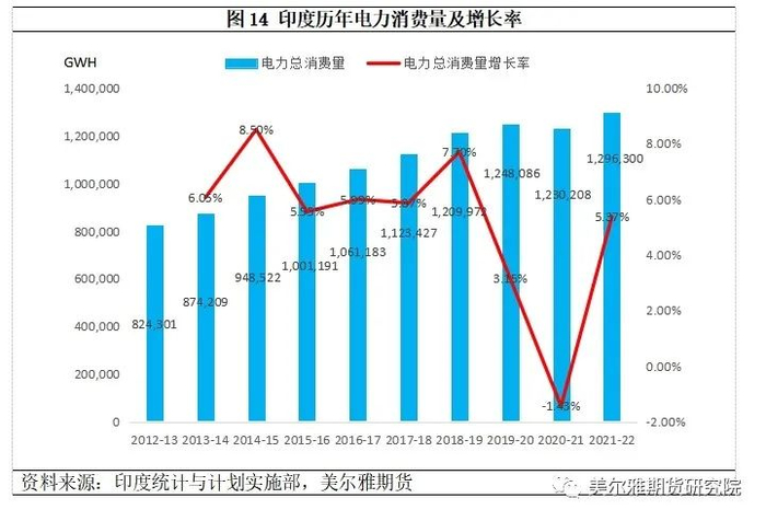 印度电力消费在过去十年间整体维持较快增长态势。2012-13财年印度用电量824,301 GWH,疫情前的2019-20财年已增长至1,248,086 GWH,增长了51%。疫情全面爆发后的2020-21财年,印度用电量增速也仅仅降低了1.43%,在之后的2021-22财年,印度用电量增速再次达到5.37%。