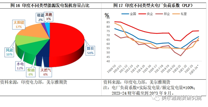 从电厂性质来看,印度私营电厂占比较高,但效率较低。截至2023年9月30日,印度发电装机容量中,私营电厂的占比达到51.1%,央企电厂占比24%, 邦企电厂占比24.9%。私营电厂的高占比得益于印度市场化进程的提升。然而,印度私营电厂的运营效率却低于国营电厂。因为国营电厂可以更加容易地获得相对更便宜地煤炭供应,而私营电厂尤其是新私营电厂的成本劣势要更大,所以私营电厂的电价经常高于国营电厂,私营电厂灵活高效发电的优势便无法发挥。2022-23财年,印度火电厂平均负荷系数为64.15%,其中央企、邦企、私营分别为74.67%、61.86%、56.64%。印度私营火电厂负荷系数远远低于央企火电厂的负荷系数,也低于印度全国火电厂平均的负荷系数。