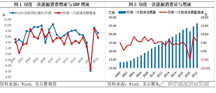 与经济增长相匹配,过去20多年,印度能源消费处于快速增长阶段。2022年,印度一次能源消费量36.44艾焦,同比增长5.62%,占世界一次能源消费总量的6%,位居世界第四,仅次于中国、美国、欧洲地区。能源消费快速增长的背后是经济的快速发展。从图1可以看出,印度一次能源消费量增速与其实际GDP增速表现出比较强的正相关关系。过去20多年中,仅2020年因受疫情影响,印度一次能源消费量出现负增长,其余年份均为正增长,其中2021年在强劲经济复苏背景下,印度一次能源消费增速达到8.66%,较疫情前的2019年增长3%,2000-2022年印度一次能源消费量复合增速4.6%。