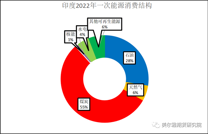 从能源消费结构来看,煤炭是印度能源消费的主体与支柱。根据BP统计数据,2022年煤炭消费占印度一次能源消费总量的55%,石油排在第二位,为28%,排在第三位的是天然气,为6%,化石燃料消费量占比接近 90%;而新能源,像风电、太阳能、生物能、核能等能源在印度能源消费结构中的占比较低。印度能源消费结构与中国非常类似,即煤炭消费“一家独大”,新能源发展相对缓慢,消费占比较低,这与发达国家以石油、天然气为主,新能源占比相对较高的能源消费结构差异显著。2022年,美国、欧洲的石油、天然气消费量可占到其一次能源消费总量的70%左右,煤炭在一次能源消费总量中的比重则低于15%。2022年美国、欧洲的核能消费占比都达到了8%,远高于印度1%的水平;其他可再生能源消费占比分别为9%、14%,也高于印度6%的水平。日本的煤炭消费占比虽然高于美国、欧洲,2022年为27%,但其能源消费结构仍是以石油、天然气为主,二者占其一次能源消费总量的比重接近60%。虽然近年来印度政府试图改变“一煤独大”的能源消费结构,但收效甚微,因新能源电厂投入成本较高,印度新能源电厂建设不及预期,现阶段的印度更需廉价稳定的电力供应,而煤炭因与铁路运输联系紧密,后者可提供大量的就业机会,因此印度以煤为主的能源消费结构短期难改。