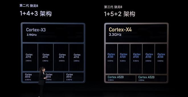 今年的高通骁龙 8 Gen 3 的 CPU 部分采用了全新的 1+5+2( 一个超大核心、五个大核、双能效核 )的核心架构,超大核主频提升到了 3.3GHz。