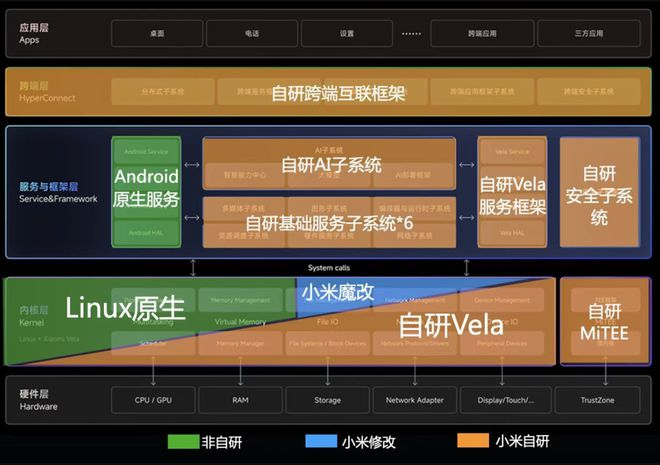 只从架构上看,澎湃OS是个安卓核心+小米自研互联模块的整合方案,但是和之前 MIUI 深度定制安卓系统的思路不同,安卓系统本身在澎湃 OS 当中的占比小了很多。