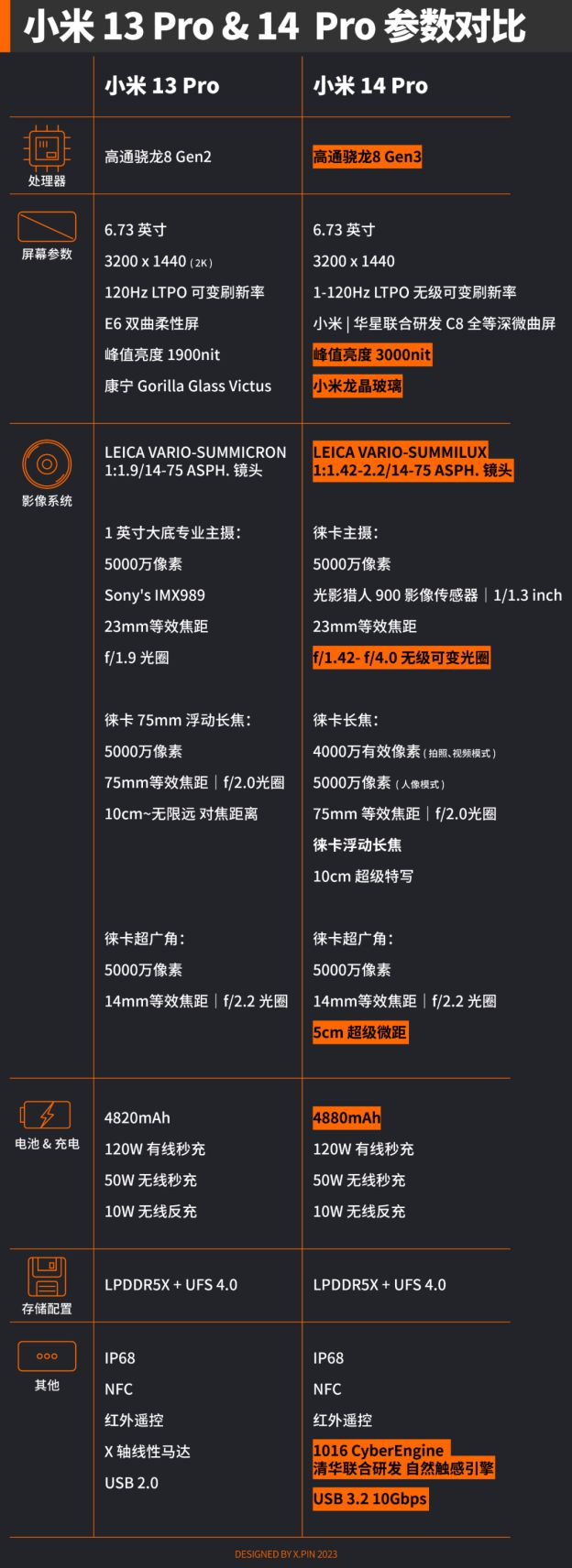 咳咳,我知道大家很急,所以就先把小米 13 系列和 14 系列的参数对比图先端上来了。